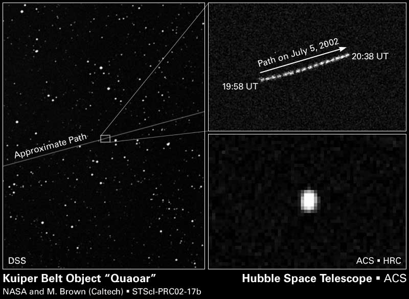 Z oboru meziplanetární hmoty je i další překvapivý objev. Začátkem října byl zveřejněn objev velké planetky, pro kterou byl navržen název Quaoar. Je to největší těleso, které bylo objeveno v posledních 72 letech, tedy od objevu Pluta v roce 1930. K objevu došlo již před několika měsíci, ale teprve v červenci a srpnu se objevitelům podařilo získat pozorovací čas na Hubbleově kosmickém teleskopu (HST), který jako jediný dokázal tento objekt zobrazit jako kotouček. Ve všech ostatních dalekohledech včetně těch největších byl Quaoar vidět jen jako svítící bod. Na snímcích z HST tak již bylo možno změřit velikost tohoto tělesa a ukázalo se, že má v průměru asi 1300 kilometrů.