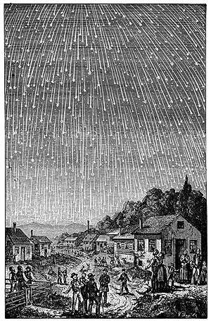 Přiložený obrázek ukazuje, jak snad mohl vypadat meteorický déšť Leonid v roce 1833. Těžko vést diskuse o reálnosti kresby, ale nepochybně toto představení zanechalo na autorovi hluboký dojem. Možná i my budeme mít v noci ze 17. na 18. listopadu podobné štěstí. Příznivější podmínky budou spíše ve druhé polovině noci a k ránu, kdy radiant (místo, ze kterého meteory zdánlivě vyletují) bude vysoko nad obzorem.