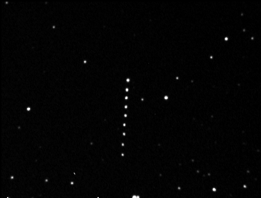 Co-added image of 9 exposures of (1620) Geographos on 1994 Sept. 3. Duration of the series is 35 minutes; large change of asteroid's brightness is apparent.