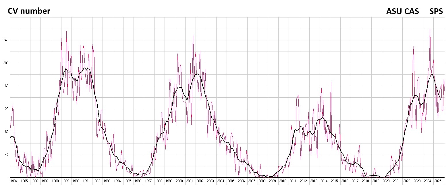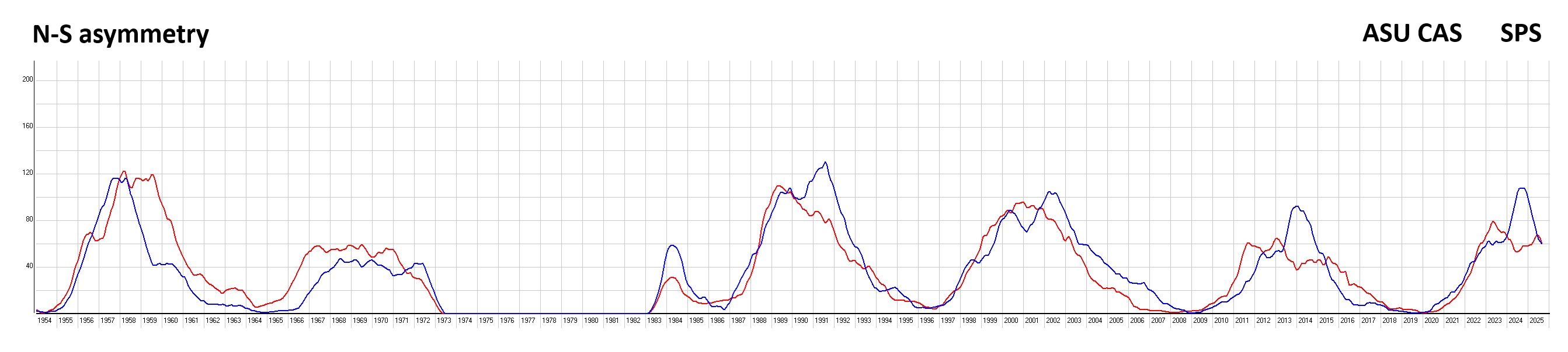 | N-S asymmetry Relative sunspot number for North (blue) and South (red) hemisphere | ![]() |