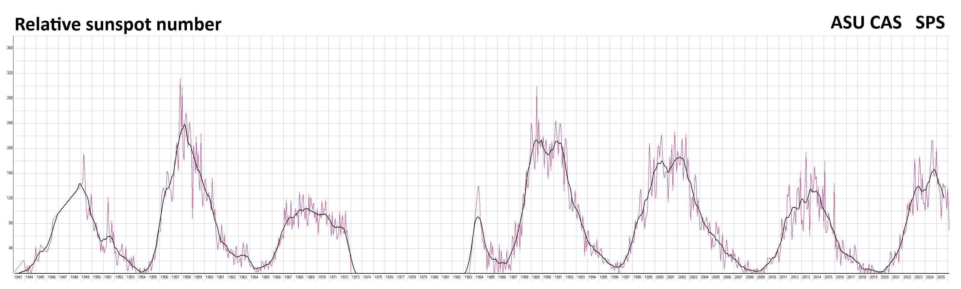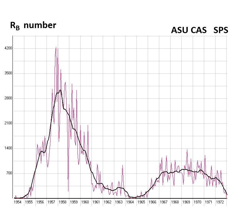 | Relative sunspot number - smoothed (1949 - 2018) 1973 - 1893 - no sunspot drawings for this period Relative sunspot number: r = 10g + f g – is the number of sunspot groups | ![]() |